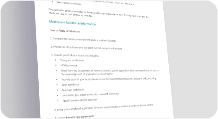 Medicare Health Medicare is Australia’s health insurance scheme and allows access to a wide range of health and hospital services at low or no cost, including: Medical services by doctors, specialists and other health professionals Hospital treatment Diagnostic imaging services such as ultrasound, CT scans, X-rays and MRI scans Prescription medicines The Australian government pays for Medicare through the Medicare levy. Working Australians pay the Medicare levy as part of their income tax. Medicare – Additional Information How to Apply for Medicare 1. Complete the Medicare enrolment application form (MS004) 2. Provide identity documents including current passport or Immicard 3. Provide proof of your visa status including: Visa grant notification VEVO print out Proof from the Department of Home Affairs that you’ve applied for permanent residency, such as an ‘Acknowledgement of application received’ letter Provide proof of your Australian citizen or Permanent Resident parent, spouse or child, including: Birth certificate Marriage certificate Joint bank, gas, water or electricity account statement Proof you own a home together 4. Bring your completed application form and supporting documents to a Medicare Service Centre. Reciprocal Health Care Agreements If you are a citizen from the following countries that have a reciprocal health care agreement with Australia, you may be eligible for Medicare while in Australia: Belgium Finland Italy Malta or the Maltese Islands ©2022 SIRVA BGRS Worldwide, Inc. Confidential and Proprietary.