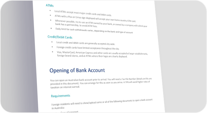 A limited number of banks are open on Saturdays. The 4 largest banks in Australia, that allow setup prior to arrival, include: National Australia Bank Commonwealth Bank Australia and New Zealand Banking Group Westpac ATMs Local ATMs accept most major credit cards and debit cards. ATMs with a Plus or Cirrus sign displayed will accept your own home country ATM card. Whenever possible, try to use an ATM owned by your bank, or owned by a company with which your bank has a partnership, to avoid ATM fees. Daily limit for cash withdrawals varies, depending on the bank and type of account Credit/Debit Cards Local credit and debit cards are generally accepted city wide. Foreign credit cards have limited acceptance throughout the city. Visa, MasterCard, American Express and other cards are usually accepted at larger establishments, foreign brand stores, and at ATMs where their logos are clearly displayed. Opening of Bank Account You can open an Australian bank account prior to arrival. You will need a Tax File Number (details on this are provided in this document). You can arrange for this as soon as you arrive. A TFN will avoid higher rates of taxation on interest earned. Requirements Foreign residents will need to show/upload some or all of the following documents to open a bank account in Australia: Copy of passport Tax File Number Formal letter of employment, issued by your employer Your passport number, email address and Visa information The date and city you’ll arrive in. Notes: Please ensure all documents are in English. ©2022 SIRVA BGRS Worldwide, Inc. Confidential and Proprietary.