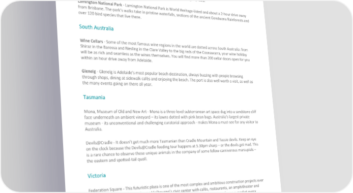 impressive sight, best enjoyed in a rented kayak from water-level. Queensland Tangalooma Island Resort - Tangalooma Island Resort has a wide array of excursions on offer, and a few of them are for free. This is the few places in the world where it is still possible to hand-feed dolphins in the wild. They come swimming up alongside the jetty at dusk for their nightly feed. Lamington National Park - Lamington National Park is World Heritage-listed and about a 2-hour drive away from Brisbane. The park’s walks take in pristine waterfalls, sections of the ancient Gondwana Rainforests and over 120 bird species that live there. South Australia Wine Cellars - Some of the most famous wine regions in the world are dotted across South Australia: from Shiraz in the Barossa and Riesling in the Clare Valley to the big reds of the Coonawarra, your wine holiday will be as rich and seamless as the wines themselves. You will find more than 200 cellar doors open for you within an hour drive away from Adelaide. Glenelg - Glenelg is Adelaide’s most popular beach destination, always buzzing with people browsing through shops, dining at sidewalk cafés and enjoying the beach. The port is also well worth a visit, as well as the many events going on there all year. Tasmania Mona, Museum of Old and New Art - Mona is a three-level subterranean art space dug into a sandstone cliff face underneath an ambient vineyard – its lawns dotted with pink bean bags. Australia's largest private museum - its unconventional and challenging curatorial approach - makes Mona a must-see for any visitor to Australia. Devils@Cradle - It doesn’t get much more Tasmanian than Cradle Mountain and Tassie devils. Keep an eye on the clock because the Devils@Cradle feeding tour happens at 5.30pm sharp – or the devils get mad. This is a rare chance to observe these unique animals in the company of some fellow carnivorous marsupials – the eastern and spotted-tail quoll. Victoria Federation Square - This futuristic plaza is one of the most complex and ambitious construction projects ever undertaken in Australia, serving as Melbourne’s civic center with cafés, restaurants, an amphitheater and several museums such as the Ian Potter center with Australian art. There’s also a farmers market every Friday and a book market on Saturdays. Royal Botanic Gardens - Arguably one of most beautiful botanic gardens in the world and the perfect place for a relaxing and picturesque picnic. It displays more than 50,000 plants and is undisputedly one of Melbourne's most popular tourist attractions. Definitely worth a visit on a sunny day in Melbourne. ©2022 SIRVA BGRS Worldwide, Inc. Confidential and Proprietary.