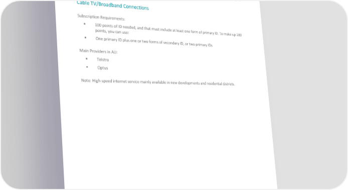 Delivery address – No delivery to PO boxes, locked bag addresses or parcel lockers as an ID and signature are required upon delivery. Proof of employment, study or pension benefits – You can provide a phone number for your employer, a student card if you're studying in Australia, or a pension card if you are receiving a government benefit. Direct debit – A direct debit from your Australian bank account or credit card is required when you first sign up. Cable TV/Broadband Connections Subscription Requirements: 100 points of ID needed, and that must include at least one form of primary ID. To make up 100 points, you can use: One primary ID plus one or two forms of secondary ID, or two primary IDs Main Providers in AU: Telstra Optus Note: High-speed internet service mainly available in new developments and residential districts. ©2022 SIRVA BGRS Worldwide, Inc. Confidential and Proprietary.