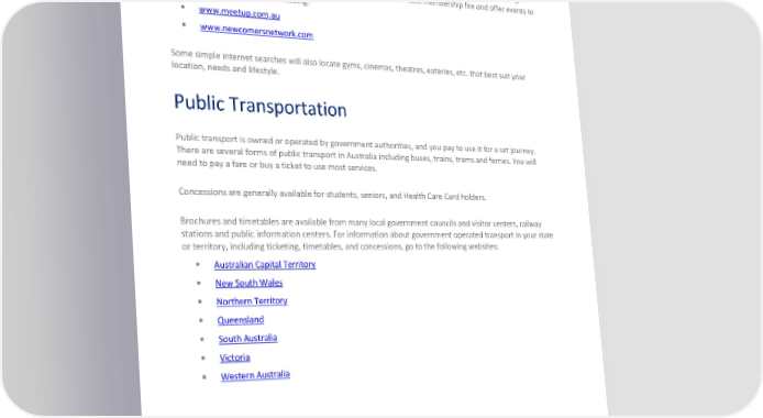 Western Australia: WA Office of Multicultural Interests Join an Association There are a range of social network opportunities. They’re not exclusive and they welcome membership from all, regardless of citizenship. They usually charge a free or low-cost membership fee and offer events to understand your city better, including: www.meetup.com.au www.newcomersnetwork.com Some simple internet searches will also locate gyms, cinemas, theatres, eateries, etc. that best suit your location, needs and lifestyle. Public Transportation Public transport is owned or operated by government authorities, and you pay to use it for a set journey. There are several forms of public transport in Australia including buses, trains, trams and ferries. You will need to pay a fare or buy a ticket to use most services. Concessions are generally available for students, seniors, and Health Care Card holders. Brochures and timetables are available from many local government councils and visitor centers, railway stations and public information centers. For information about government operated transport in your state or territory, including ticketing, timetables, and concessions, go to the following websites: Australian Capital Territory New South Wales Northern Territory Queensland South Australia Victoria Western Australia ©2022 SIRVA BGRS Worldwide, Inc. Confidential and Proprietary.