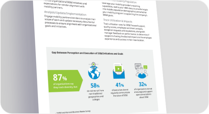 Diversity, Equity & Inclusion Considerations for Mobility Programs 5 Diverse Employee Populations Analytics Support supply chain e昀昀orts to identify and partner Leverage your mobility data to assess your mobility with vendors who support a diverse employee program’s alignment and progress in achieving your population and/or utilize other vendors with diverse organization’s DE&I initiatives and goals. employee populations. Window into Mobility Population Setting Expectations Leverage your mobility provider’s reporting Review organizational DE&I initiatives and capabilities, tied to your HRIS data, to provide insight expectations for vendor alignment with into mobile population demographics and whether mobility partners. your mobility program is supporting the company’s Analysis/Update/Implementation DE&I goals. Engage mobility partners/vendors to analyze their Track Utilization & Impacts scope of work and update necessary documents/ Track utilization rates for DE&I focused support, processes to ensure alignment with organizational quality scores, employee sentiment analysis, goals and initiatives. exception requests and escalations, along with manager feedback on performance, to determine if support is having the desired impacts to the employee experience and success in their new location. Gap Between Perception and Execution of DE&I Initiatives and Goals 87% of organizations say they track diversity, but: 58% 41% 32% do not recruit from of executives do not of organizations do not non-traditional regularly communicate encourage and support geographies and the value of DE&I open conversations colleges about DE&I – SHRM and Harvard Business Review Survey For further information on aligning DE&I initiatives with your mobility program, or assessing your overall mobility program, contact SIRVA Global Advisory Services at globaladvisoryservices@sirva.com or reach out to your SIRVA account manager or SIRVA sales representative.