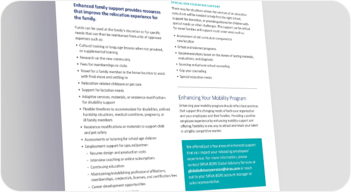FAMILY SUPPORT LOCAL NETWORKING FOR SPOUSES/PARTNERS Many organiza琀椀ons have expanded their tradi琀椀onal spouse/ Provide addi琀椀onal des琀椀na琀椀on support to connect spouses/ partner support to include the employee’s accompanying partners with volunteer and social organiza琀椀ons. Connec琀椀ng family, ensuring mobility support is provided in ways that spouses/partners with organiza琀椀ons aligned with their are meaningful and inclusive to all groups. Family support interests in the departure loca琀椀on, or expanding their provides resources to help acclimate to the des琀椀na琀椀on and interests, can help newcomers have a smoother transi琀椀on to cover costs that enhance the reloca琀椀on experience. Support the new loca琀椀on. can be provided for both intra-country and cross-border SPECIALIZED EDUCATION SUPPORT reloca琀椀ons or long-term assignments. There may be situa琀椀ons where the services of an educa琀椀on consultant will be needed to help 昀椀nd the right school, Enhanced family support provides resources that improve the reloca琀椀on experience for support the transi琀椀on, or provide guidance for children with special needs or other challenges. This support can be cri琀椀cal the family. for some families and support could cover areas such as: Funds can be used at the family’s discre琀椀on or for speci昀椀c • Assessment of old curriculum compared to needs that can then be reimbursed from a list of approved new loca琀椀on expenses such as: • Gi昀琀ed and talented programs • Cultural training or language lessons when not provided, • Recommenda琀椀ons based on the review of tes琀椀ng materials, or supplemental training • Research on the new community evalua琀椀ons, and diagnosis • Fees for memberships or clubs • Boarding and private school counseling • Travel for a family member in the home loca琀椀on to assist • Gap year counseling • Special educa琀椀on needs with 昀椀nal move and se琀琀ling-in • Reloca琀椀on-related childcare or pet care • Support for lacta琀椀on needs • Adap琀椀ve services, materials, or residence modi昀椀ca琀椀ons Enhancing Your Mobility Program for disability support • Flexible 琀椀melines to accommodate for disabili琀椀es, de昀椀ned Enhancing your mobility program should re昀氀ect best prac琀椀ces hardship situa琀椀ons, medical condi琀椀ons, pregnancy, or that support the changing needs of both your organiza琀椀on and your employees and their families. Providing a posi琀椀ve ill family members employee experience by enhancing mobility support and • Residence modi昀椀ca琀椀ons or materials to support child o昀昀ering 昀氀exibility is one way to a琀琀ract and retain your talent and pet safety in a highly compe琀椀琀椀ve market. • Assessments or tutoring for school age children • Employment support for spouse/partner: – Resume design and produc琀椀on costs We o昀昀ered just a few areas of enhanced support – Interview coaching or online subscrip琀椀ons that can impact your reloca琀椀ng employees’ – Con琀椀nuing educa琀椀on experience. For more informa琀椀on, please contact SIRVA BGRS Global Advisory Services at – Maintaining/establishing professional a昀케lia琀椀ons, [email protected] or reach memberships, creden琀椀als, licenses, and cer琀椀昀椀ca琀椀on fees out to your SIRVA BGRS account manager or – Career development opportuni琀椀es sales representa琀椀ve. – Travel expenses for interviews Impac琀椀ng the Employee Experience by Enhancing Support ©2022 SIRVA BGRS 4