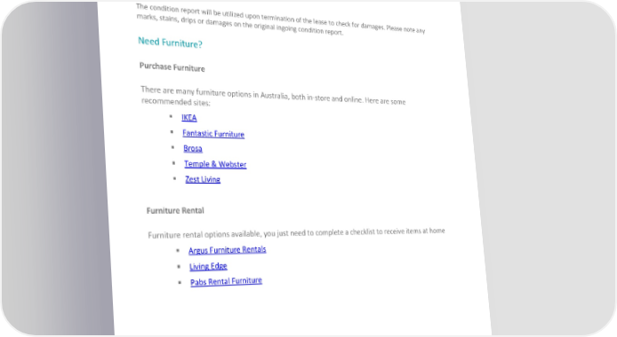 Application of utilities and telecom facilities Utilities and internet/cable TV can be applied with the assistance of your local relocation consultant. Handover Collection of keys/access cards from the agency on the day of the lease start date. A condition report will be provided and returned within the time frame specified by the agency. Please note: The condition report will be utilized upon termination of the lease to check for damages. Please note any marks, stains, drips or damages on the original ingoing condition report. Need Furniture? Purchase Furniture There are many furniture options in Australia, both in-store and online. Here are some recommended sites: IKEA Fantastic Furniture Brosa Temple & Webster Zest Living Furniture Rental Furniture rental options available, you just need to complete a checklist to receive items at home Argus Furniture Rentals Living Edge Pabs Rental Furniture ©2022 SIRVA BGRS Worldwide, Inc. Confidential and Proprietary.