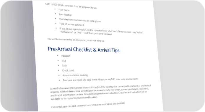 Emergency & Useful Contacts In an emergency, telephone 000 for: Police Ambulance Fire Brigade Calls to 000 (triple zero) are free. Be prepared to say: Your name Your location The telephone number you are calling from Type of service you need If you do not speak English, let the operator know what kind of help you need – say “Police”, “Ambulance” or “Fire” – and then speak your language You will be connected to an interpreter, so do not hang up. Pre-Arrival Checklist & Arrival Tips Passport Visa Cash Credit card Accommodation booking Purchase a prepaid SIM card at the Airport or any 7-11 store using your passport. Australia has nine international airports throughout the country that connect with a network of smaller local airports. All the international airports provide access to duty-free shops, currency exchanges, restaurants, and tourist information centers. Ground transportation includes buses, coaches and taxis which will be available to ferry you to your desired location. Car rental agencies and, in some cases, limousine services are also available. Major airports include: Adelaide International Airport and the Domestic Terminal are only 6km away from the city center. The Skylink Airport Shuttle bus links the airport to Adelaide Parklands Rail Terminal and the city center, while local buses also link the airport to the Adelaide suburbs. There are taxi services as well as car rental available and travelling to town by car is approximately 10 mins. Melbourne Airport is located approximately 21 km/13 miles northwest of Melbourne. Travel time from the ©2022 SIRVA BGRS Worldwide, Inc. Confidential and Proprietary.