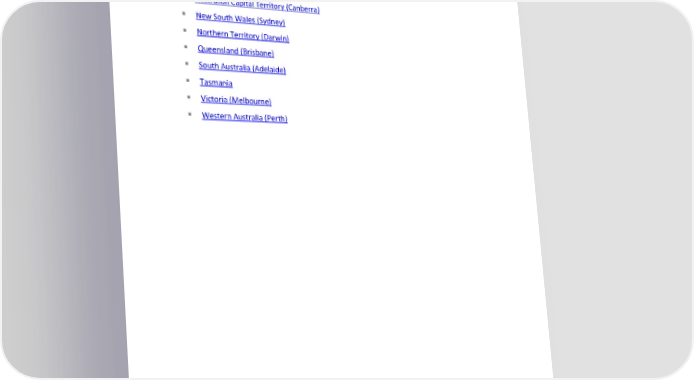 Activities for Children and Families In Australia, it is not difficult to find activity centers. Australians tend to enjoy getting out and about in their free time. Each state is full of activities to experience and areas for you and your family to explore. Please check below lists for your reference: Australian Capital Territory (Canberra) New South Wales (Sydney) Northern Territory (Darwin) Queensland (Brisbane) South Australia (Adelaide) Tasmania Victoria (Melbourne) Western Australia (Perth) ©2022 SIRVA BGRS Worldwide, Inc. Confidential and Proprietary.