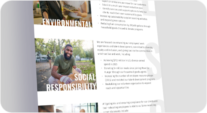 De昀椀ning our sustainability strategies and goals has been a top priority, including: • Maintaining ISO 14001 certi昀椀cation in APAC and Europe • Introducing a new customer emissions monitoring and o昀昀set program to: ° Capture Scope 1, 2 and 3 emission data ° Report on emissions per move for our customers ° Establish a multi-year impact reduction plan ° Identify services and support options to help our clients reach their own sustainability goals • Increasing sustainability supplier sourcing activities and expand green options • Reducing fuel consumption by 392,400 gallons through ENVIRONMENTAL household goods Discard & Donate programs We are focused on enhancing our employees’ work experiences and talent development, committed to diversity, equity and inclusion, and giving back to the communities in which we live and work, including: • Achieving $77.2 million in U.S. diverse-owned spend in 2023 • Donating 5+ million meals since joining Move For Hunger through our household goods agents SOCIAL • Increasing the number of employee resource groups (ERGs) and revisited our talent development programs • Revitalizing our volunteer organization to expand RESPONSIBILITY reach and opportunities Mitigating risk and ensuring compliance for our clients and their relocating employees is vital to us. Some recent key accomplishments include: • Completion of annual SOC Type 2 audit • Appointment of Sirva’s General Counsel to Co-chair WERC’s Global Regulatory & Compliance Forum • Renewal of IS0 27001, 9001, 14001, and 45001 certi昀椀cations • Signatory and participant of the UN Global Compact GOVERNANCE • Endorsement of Reconciliation Action Plan in ANZ