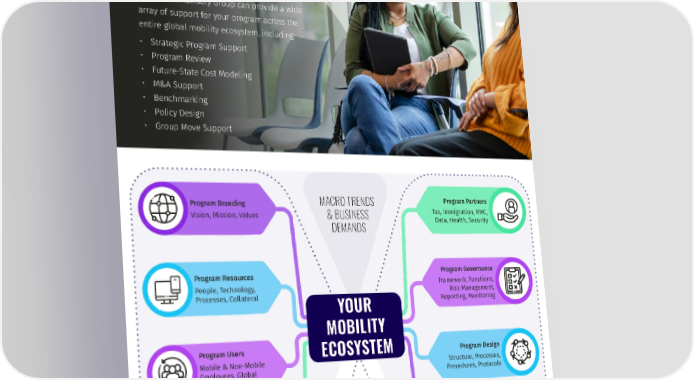 STRATEGIC SUPPORT Our Global Advisory Group can provide a wide array of support for your program across the entire global mobility ecosystem, including: • Strategic Program Support • Program Review • Future-State Cost Modeling • M&A Support • Benchmarking • Policy Design • Group Move Support Program Branding MACRO TRENDS Program Partners Vision, Mission, Values & BUSINESS Tax, Immigration, RMC, DEMANDS Data, Health, Security Program Resources Program Governance People, Technology, Framework, Functions, Processes, Collateral Risk Management, YOUR Reporting, Monitoring MOBILITY Program Users ECOSYSTEM Program Design Mobile & Non-Mobile Structure, Processes, Employees, Global Procedures, Protocols Mobility Team Business Stakeholders Policy Support Human Resources, Talent Review, Benchmarking, Acquisition, Payroll, Legal, EMPLOYEE Design, Creation Procurement, DEIB EXPERIENCE