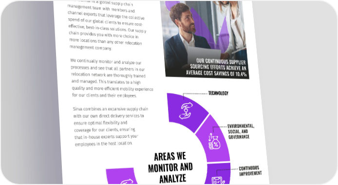 PROVEN PARTNERS Sirva maintains a global supply chain management team with members and channel experts that leverage the collective spend of our global clients to ensure cost- e昀昀ective, best-in-class solutions. Our supply chain provides you with more choice in more locations than any other relocation management company. OUR CONTINUOUS SUPPLIER We continually monitor and analyze our SOURCING EFFORTS ACHIEVE AN processes and see that all partners in our AVERAGE COST SAVINGS OF 10.4% relocation network are thoroughly trained and managed. This translates to a high quality and more e昀케cient mobility experience TECHNOLOGY for our clients and their employees. Sirva combines an expansive supply chain with our own direct delivery services to ensure optimal 昀氀exibility and ENVIRONMENTAL, coverage for our clients, ensuring SOCIAL, AND that in-house experts support your GOVERNANCE employees in the host location. AREAS WE MONITOR AND CONTINUOUS ANALYZE IMPROVEMENT CUSTOMER SATISFACTION PERFORMANCE FINANCIAL CONTROLS